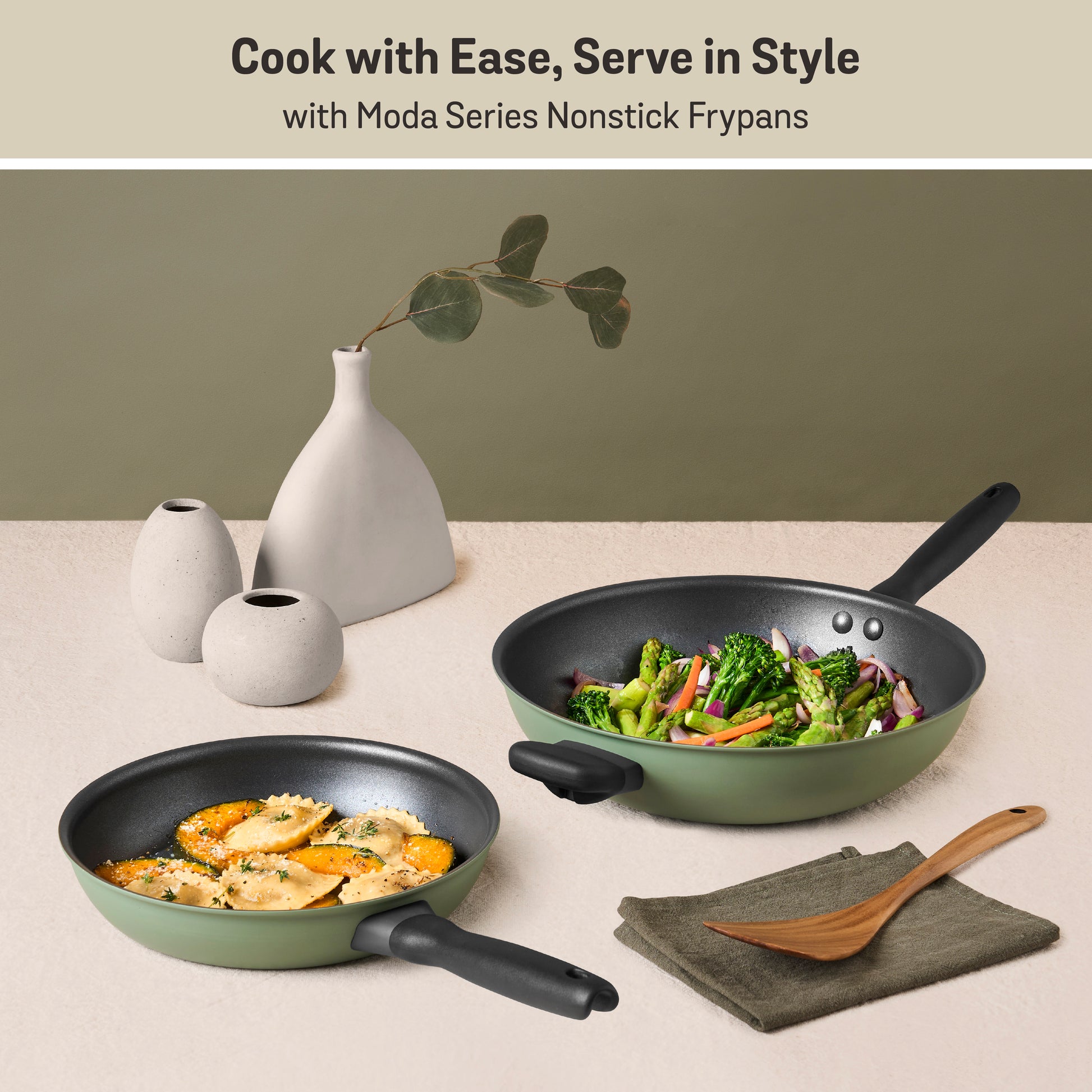 The Meyer Moda Series 32cm Stirfry delivers effortless cooking and sleek style, with a ceramic-reinforced nonstick surface that lasts 8x longer* and withstands 25,000 scrubs^.