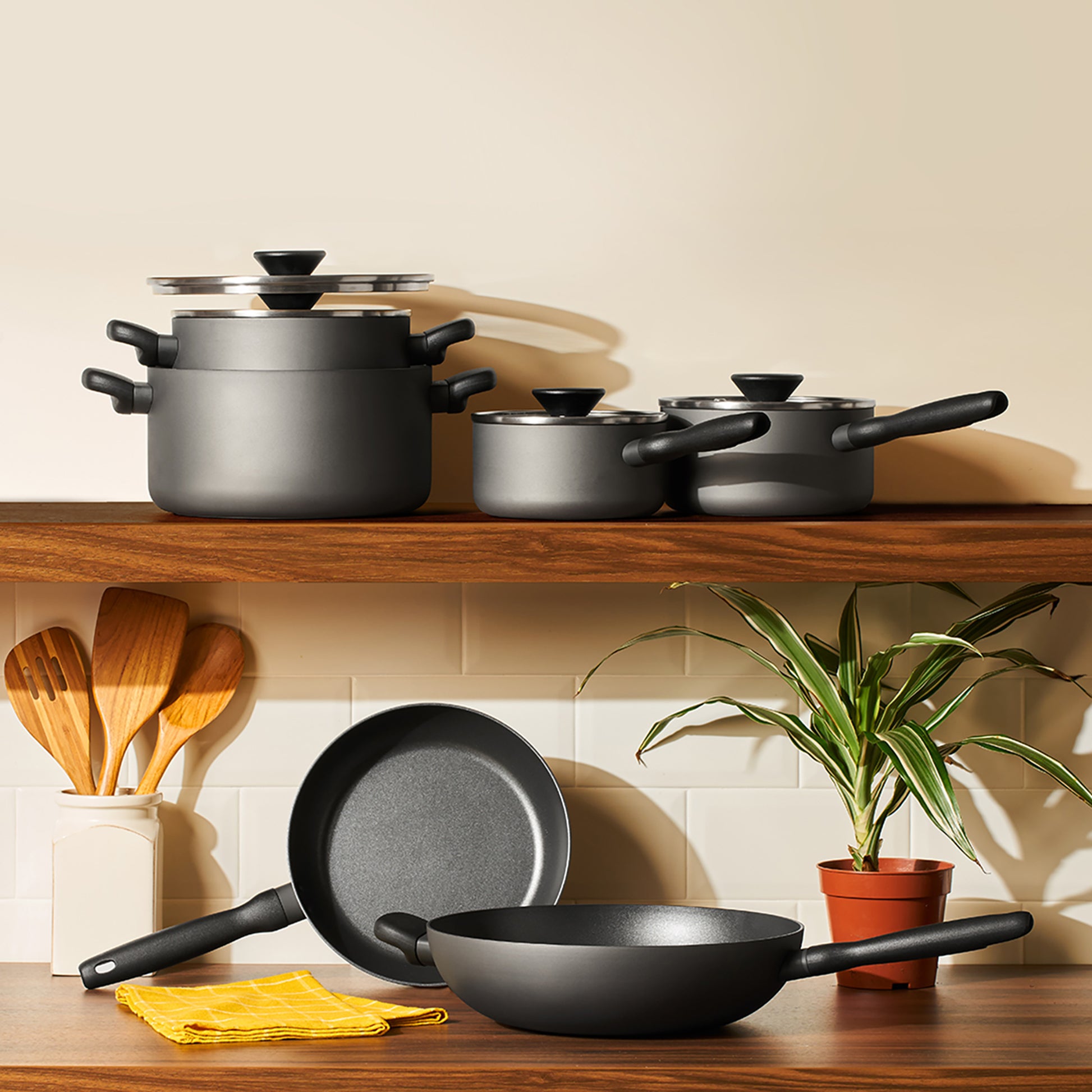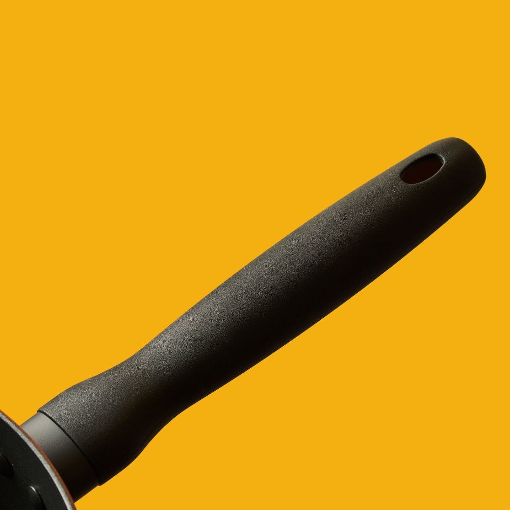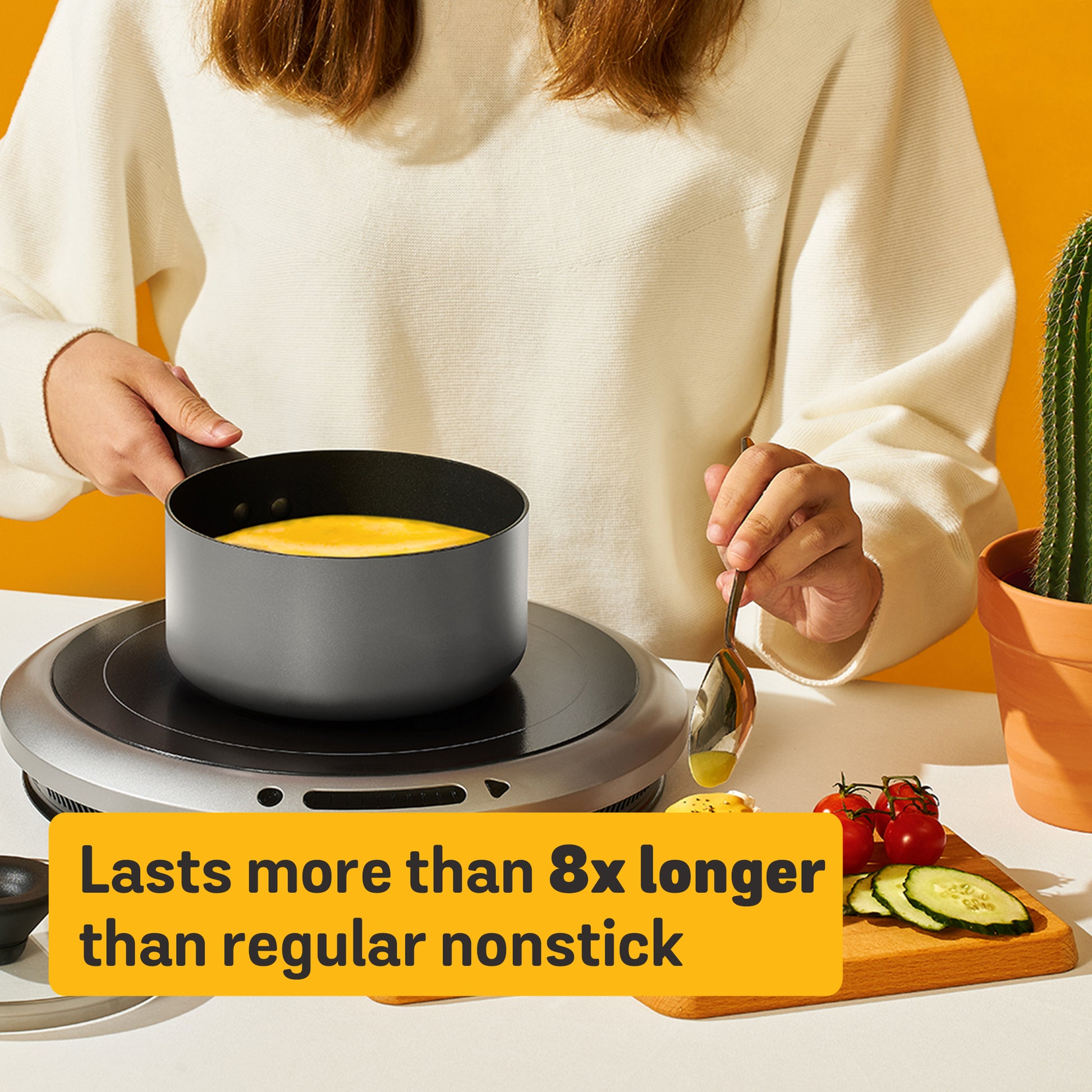 The nonstick rivets and rims prevent burnt, stuck food, while the fully covered, coated base with zero exposed aluminium prevents corrosion and staining. The comfortable, ergonomic, phenolic handle stays cool to the touch and is hangable for convenient storage. Additionally, the non-toxic, PFOA-free nonstick coating makes clean up a breeze. Plus, it's dishwasher safe, oven safe and can withstand up to 25,000 scrubs*, all in a sleek and modern Sesame Grey finish.