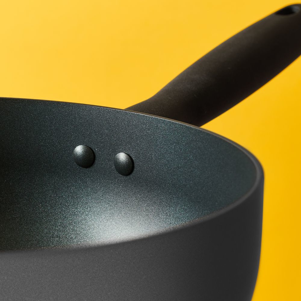 - TOUGH NONSTICK FINISH ON RIVETS AND RIMS prevents stains and burnt, stuck food